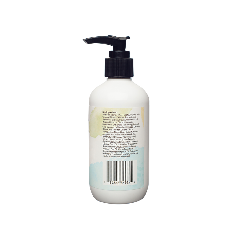 Aloe Barbadensis (Aloe) Leaf Juice, Glycerin, Cetearyl Alcohol, Glyceryl Stearate, Rosmarinus Officinalis (Rosemary) Extract, Olea Europaea (Olive) Leaf Extract, Prunus Amygdalus Dulcis (Sweet Almond) Oil, Cetearyl Olivate and Sorbitan Olivate, Glyceryl Caprylate, Simmondsia Chinensis (Jojoba) Seed Oil, Davidsonia Jerseyana (Davidson Plum) extract, Telopea Speciosissima (Waratah) Extract, Syzygium Luehmannii (Riberry) Extract, Citrus australasica (Finger Lime) Extract, Symphytum Officinale (Comfrey Root) Extract, Avena Sativa (Oats) Extract, Lavandula Angustifolia (Lavender) Oil, Citrus Aurantium Dulcis (Orange) Peel Oil, Citrus Aurantium Bergamia (Bergamot) Fruit Oil, Origanum Marjorana (Marjoram) Leaf Oil, Anthemis Nobilis (Chamomile) Flower Oil, Sodium Benzoate