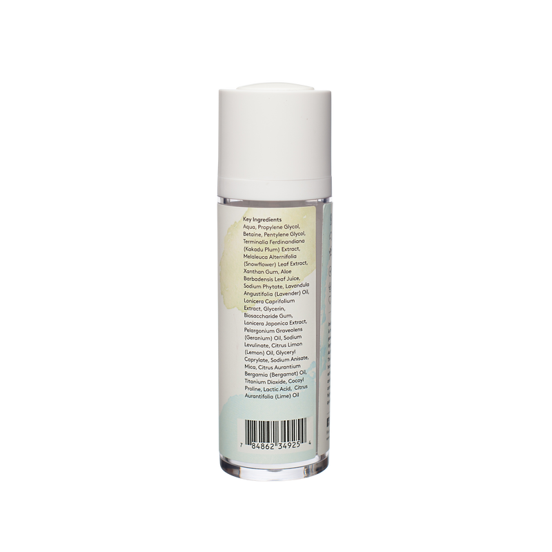 Aqua, Propylene Glycol, Betaine, Pentylene Glycol, Xanthan Gum, Aloe Barbadensis Leaf Juice, Sodium Phytate, Lonicera Caprifolium Extract, Glycerin, Biosaccharide Gum, Lonicera Japonica Extract, Sodium Levulinate, Glyceryl Caprylate, Sodium Anisate, Mica, Titanium Dioxide Cocoyl Proline, Lactic Acid, Terminalia Ferdinandiana (Kakadu Plum) Extract, Melaleuca Alternifolia (Snowflower) Leaf Extract (2.5%), Lavandula Angustifolia (Lavender) Oil, Pelargonium Graveolens (Geranium) Oil, Citrus Limon (Lemon) Oil, Citrus Aurantifolia (Lime) Oil